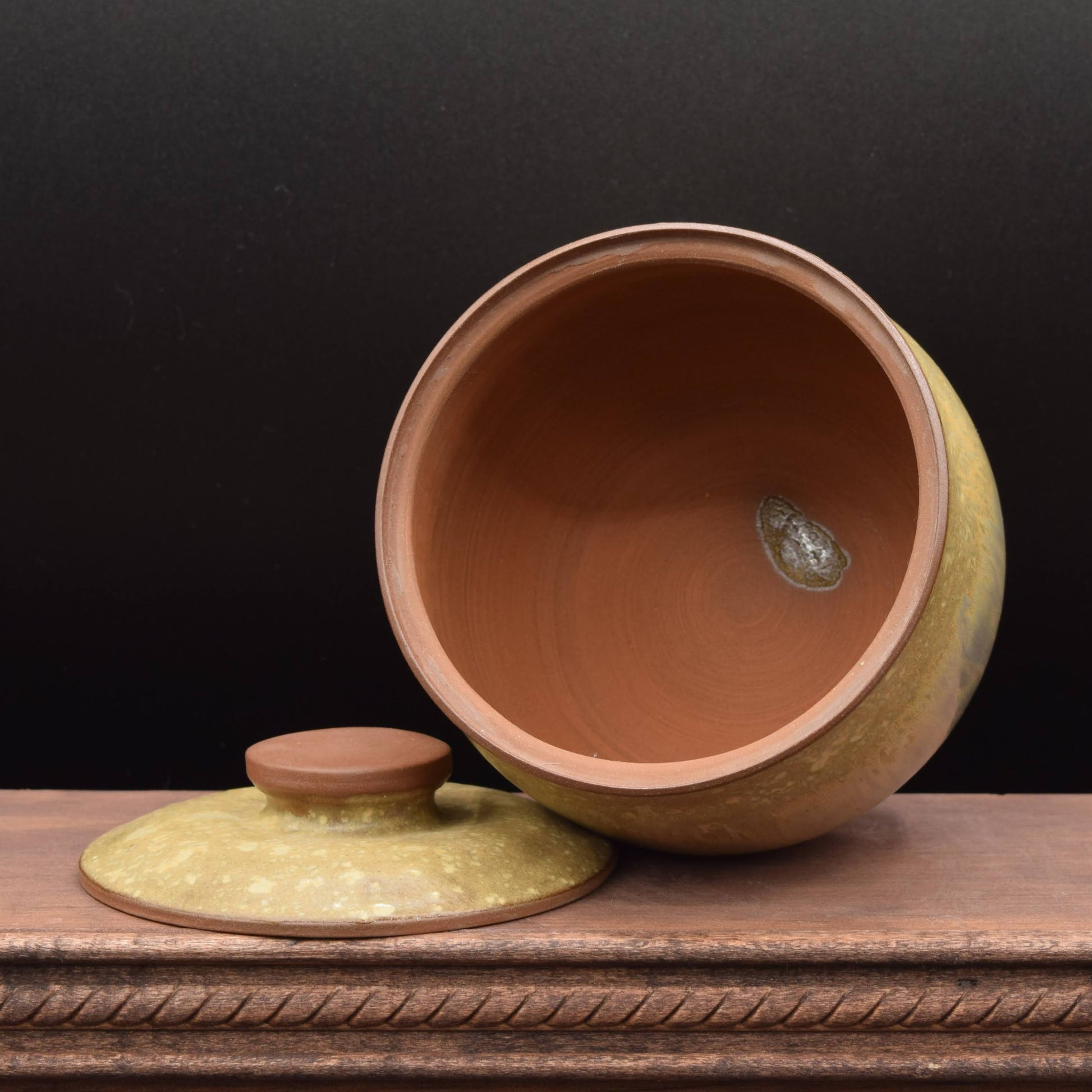 This is a handmade, unique, ceramic jar that can comfortably hold 11 fluid ounces inside. However, this jar is not meant for liquids, but for dry ingredients.